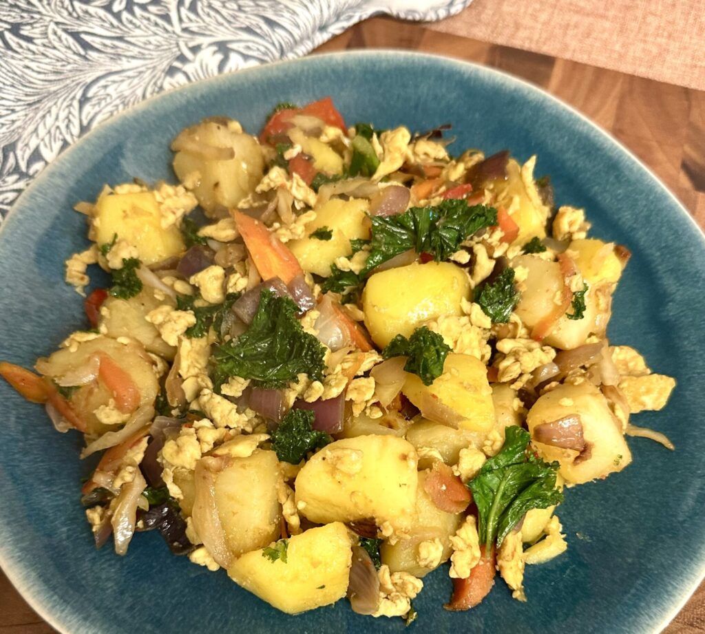 This simple mix of boiled potatoes, scrambled eggs, and colourful veggies makes a comfort meal that’s filling, familiar, and full of flavour.